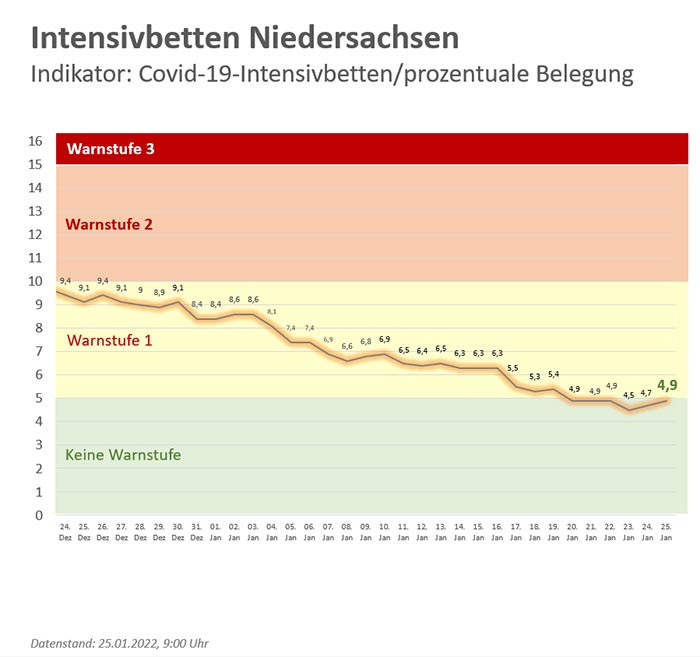 - der landesweite prozentuale Anteil COVID-19 Erkrankter an der Intensivbettenbelegung bei 4,9 %