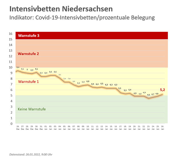 - der landesweite prozentuale Anteil COVID-19 Erkrankter an der Intensivbettenbelegung bei 5,2 %
