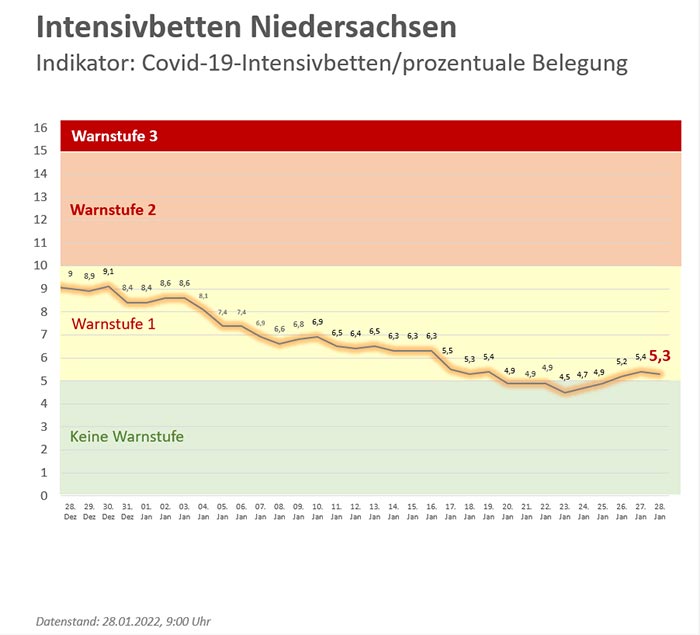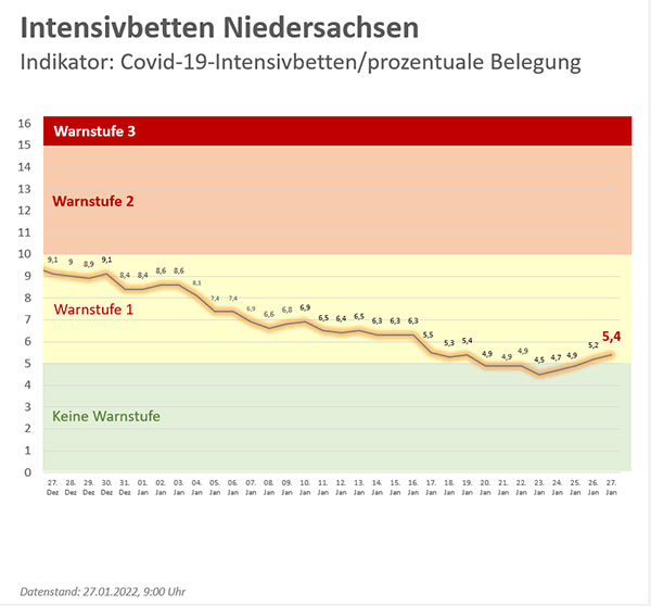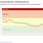- der landesweite prozentuale Anteil COVID-19 Erkrankter an der Intensivbettenbelegung bei 5,4 %