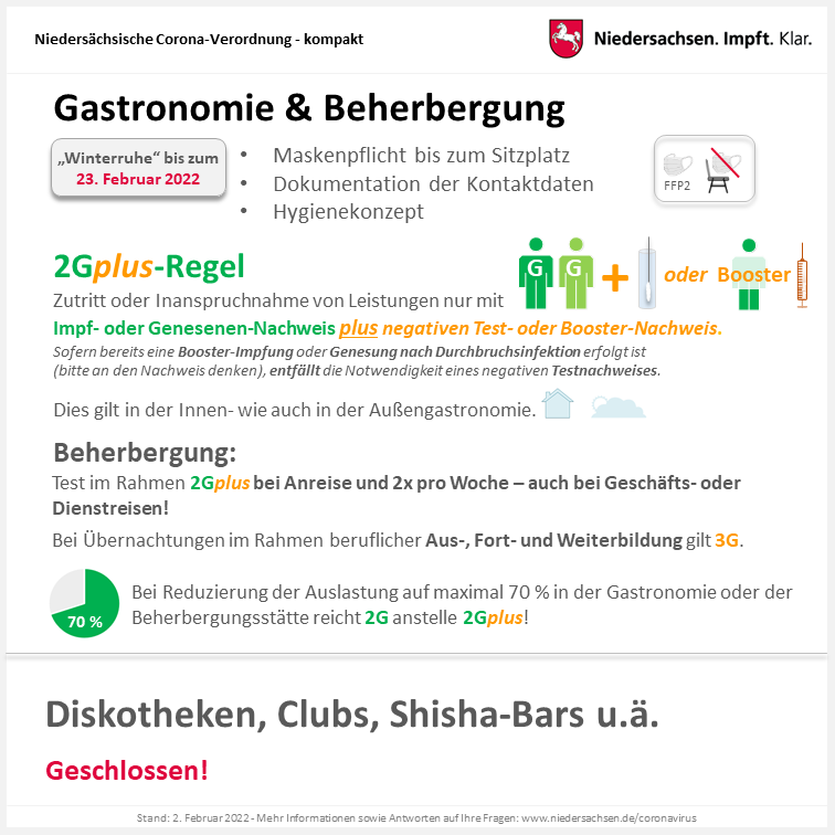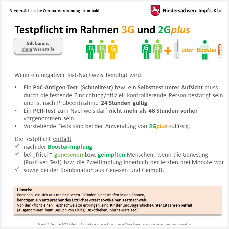 Im Rahmen der „2G-plus“-Regelung entfällt die zusätzliche Testpflicht für Personen mit einer Dritt-Impfung („Booster“), für Personen die einmal geimpft und genesen sind, für „frisch Zweitgeimpfte“ (Zweitimpfung höchstens 90 Tage alt) und für Genesene deren Nachweis mindestens 28 Tage und höchstens 90 Tage zurückliegt.