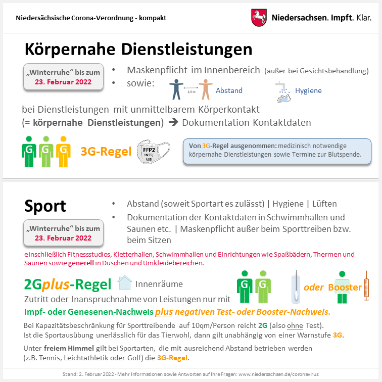 Nachdem das OVG Lüneburg die 2G-Regel für Sport im Freien gekippt hatte, gilt für Sport im Freien unter Warnstufe 2 und 3 die 3G-Regel, sofern der Mindestabstand von 1,5 Metern ständig eingehalten werden kann. Ist dies nicht der Fall, beispielsweise beim Tennis-Doppel oder bei größeren Gruppen im Golf- oder Laufsport, gilt 2G-plus.