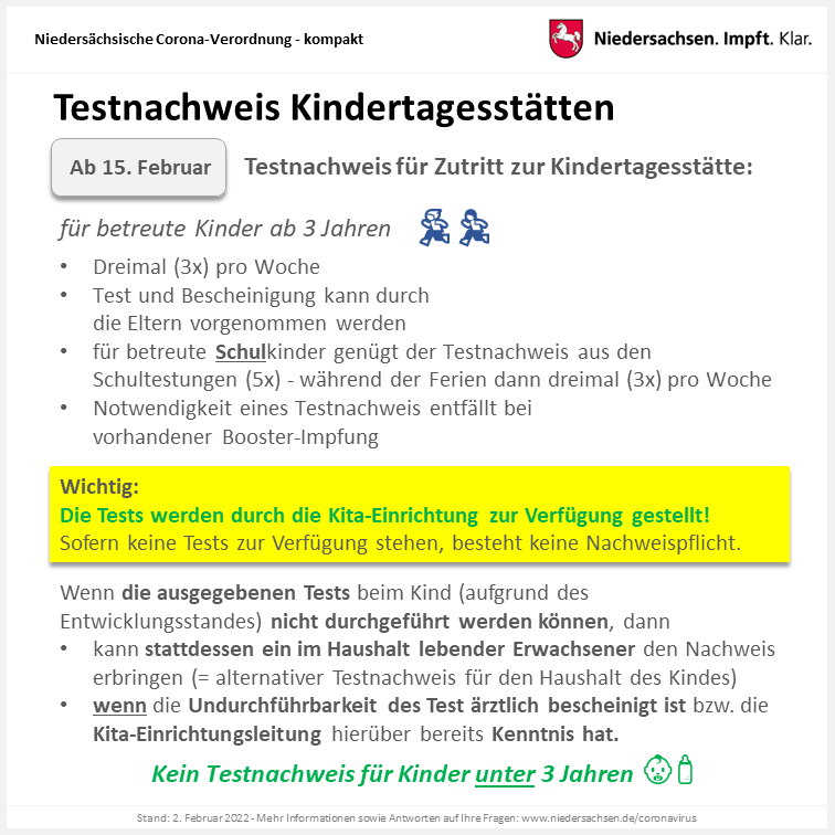 Zum 15. Februar wird aus dem freiwilligen Testangebot für Kita-Kinder eine Testpflicht (ab 3 Jahren), drei Mal pro Woche. Sollte das Testen eines Kindergartenkindes nicht möglich sein (ärztlicher Nachweis nötig), muss ein Elternteil den Test drei Mal pro Woche an sich durchführen.