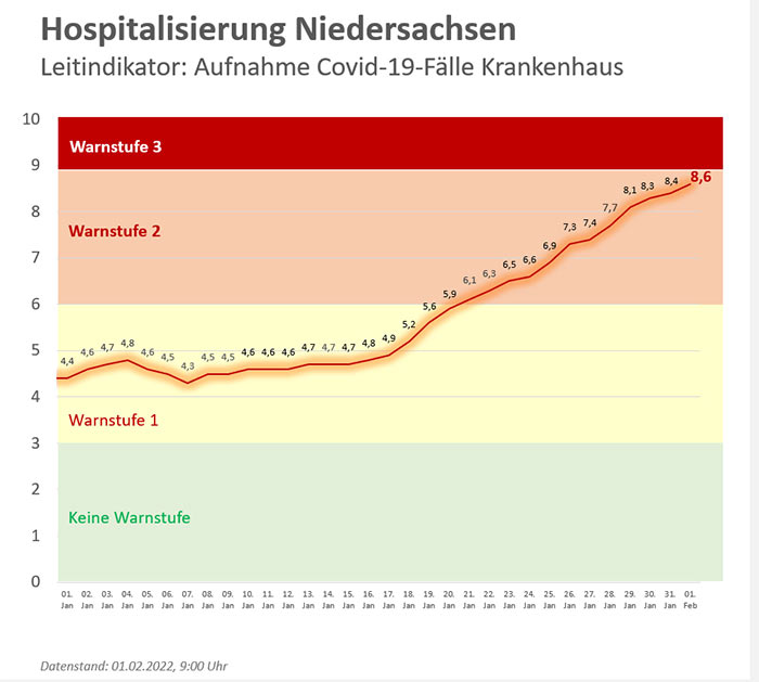 - die landesweite 7-Tages-Hospitalisierungsinzidenz (Neuaufnahmen COVID-19 Patienten) bei 8,6;
