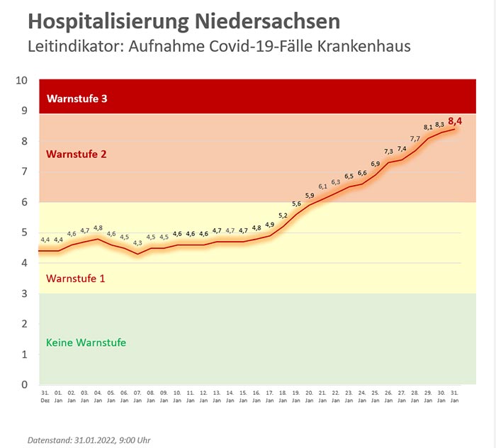 - die landesweite 7-Tages-Hospitalisierungsinzidenz (Neuaufnahmen COVID-19 Patienten) bei 8,4;