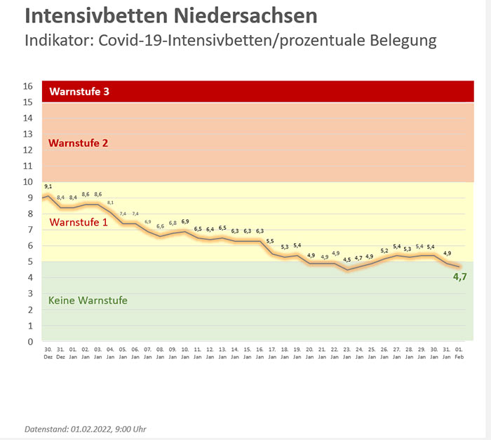 - der landesweite prozentuale Anteil COVID-19 Erkrankter an der Intensivbettenbelegung bei 4,7 %
