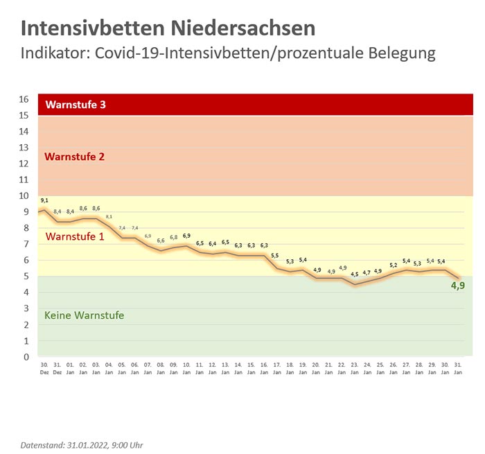 - der landesweite prozentuale Anteil COVID-19 Erkrankter an der Intensivbettenbelegung bei 4,9 %
