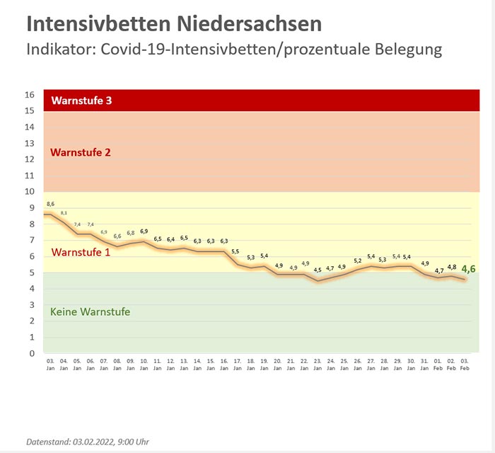 - der landesweite prozentuale Anteil COVID-19 Erkrankter an der Intensivbettenbelegung bei 4,6 %