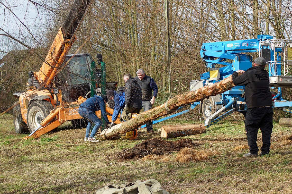 Ohne viel Zeit zu verlieren, denn das Storchenpaar kontrollierte das Treiben auf dem Boden mit zeitweisen Überflügen, machte sich die Dorfgemeinschaft mit Bernd Wilharm, Günter Steierberg, Kirsten Katzke, Simone Krämer, Timon Paul Schöniger, sowie Oliver und Heinz Prasse mit Kettensäge und Kleinwerkzeug an die letzten Maßnahmen, montierten das alte Nest und legten mit der Kettensäge letzte Hand an für das Einpassen des neuen Baumstamms in das Ständerwerk.