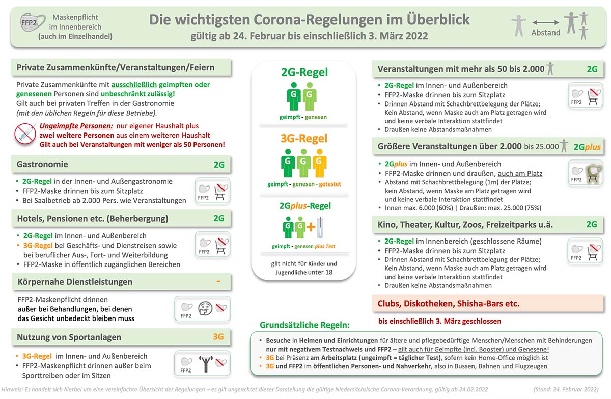 Niedersachsen hat die angekündigte Änderung der Corona-Verordnung veröffentlicht. Die geänderte Verordnung gilt in ihrer neuen Form nur für acht Tage, bis einschließlich 3. März. Ab dem 4. März greift bereits die nächste Änderung. Diese gilt dann bis zum 19. März, ehe ab dem 20. März die allermeisten Corona-Regeln wegfallen.
