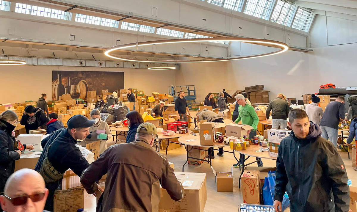 Blau-gelbe Luftballons waren am Grundstückszaun angebracht, um den Weg zur Annahmestelle zu weisen. Die Spendengüter wurden dank zahlreicher fleißiger Helfer und Unterstützer direkt verpackt und in Transporter verladen. 16 Fahrzeuge machten sich direkt nach dem Beladen auf den rund 1.500 Kilometer weiten Weg in Richtung Ukraine.