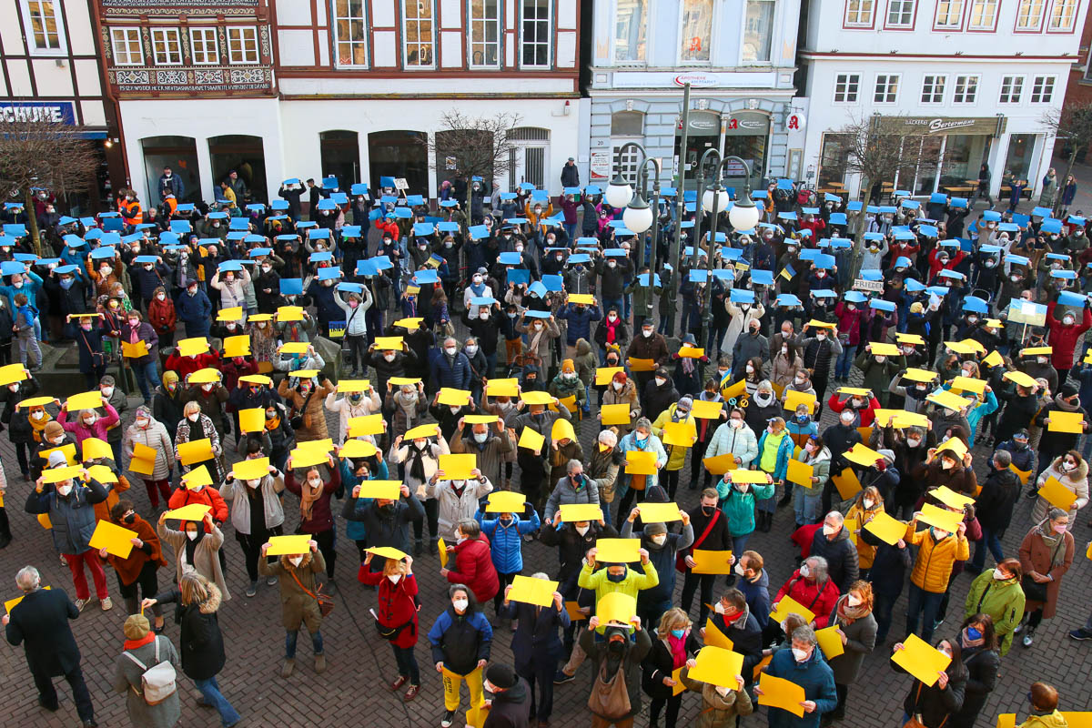 (Stadthagen) Rund 350 Menschen haben am Samstag unter dem Motto „Stadthagen zeigt Flagge“ bei einer von der Stadt und der St. Martini-Kirchengemeinde organisierten Kundgebung auf dem Marktplatz Stellung gegen den Angriffskrieg Russlands in der Ukraine bezogen.