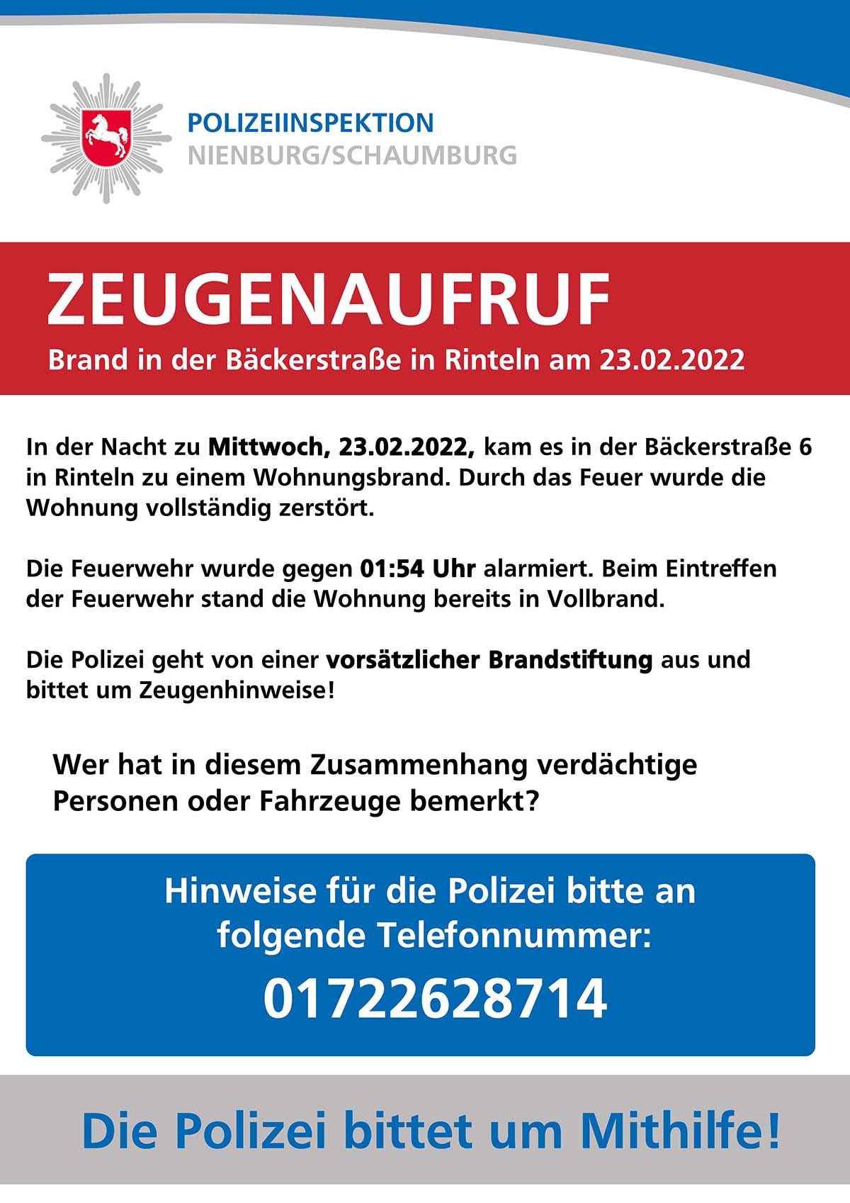 Ermittler und Staatsanwaltschaft gehen von einer vorsätzlichen Brandstiftung aus. Die Polizei Rinteln bittet jetzt um Zeugenhinweise: