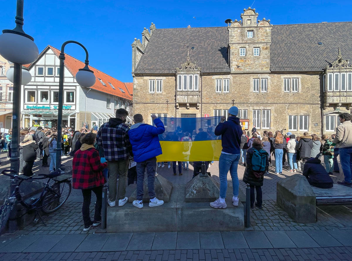 Wie Schulleiterin Angelika Hasemann vor Ort berichtet, sei aus Reihen der Schülervertretung aus aktuellem Anlass des Ukraine-Krieges der Wunsch zu einer Demo geäußert worden. Zunächst sei eine Menschenkette angedacht gewesen, die vom Ratsgymnasium bis zum Marktplatz reiche. Diese Idee wurde zugunsten eines Sternmarsches verworfen. Die Schüler hatten sich in den Nebenstraßen positioniert und strömten dann alle pünktlich zum Glockengeläut auf den Marktplatz zusammen.