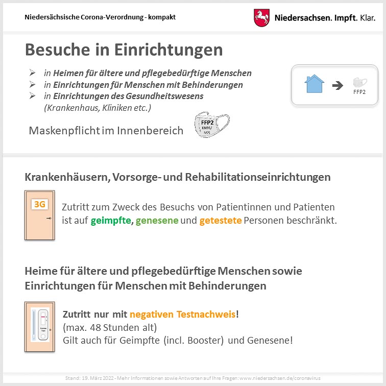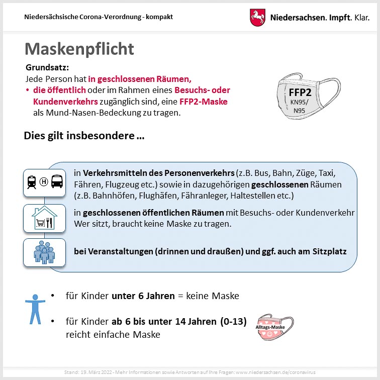 In Bussen, Bahnen und Flugzeugen gilt FFP2-Maskenpflicht, für Besuche in Heimen und Pflegeeinrichtungen ist ein negatives Testergebnis plus FFP2-Maske nötig, auch bei Geimpften, Genesenen und Geboosterten. Bei Versammlungen unter freiem Himmel, also Demos oder Kundgebungen, gilt grundsätzlich FFP2-Maskenpflicht.