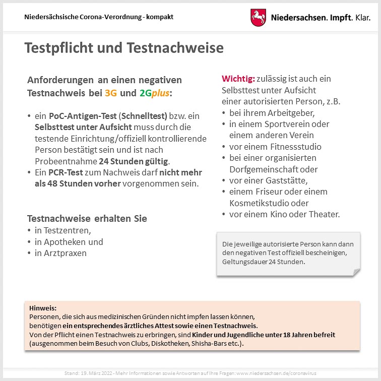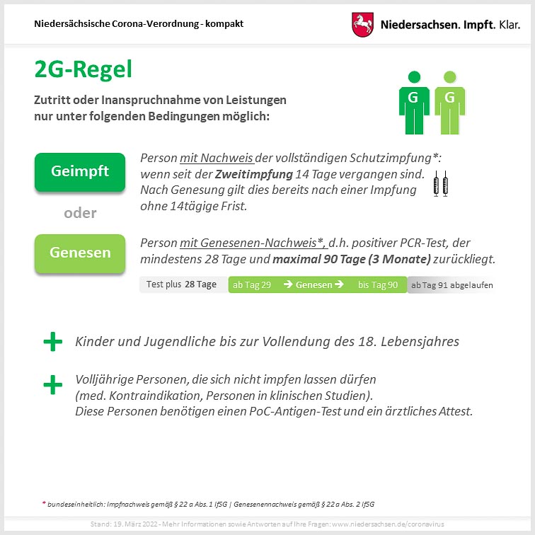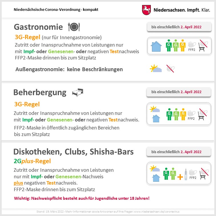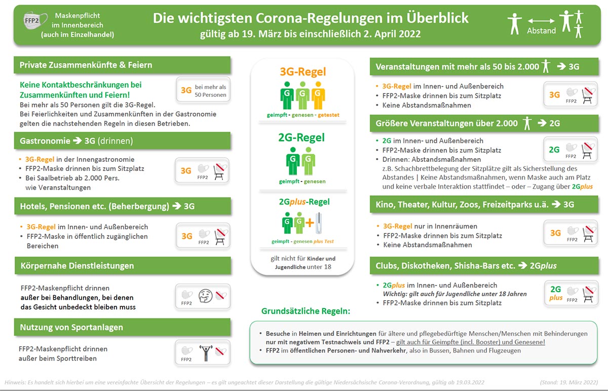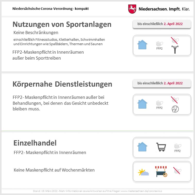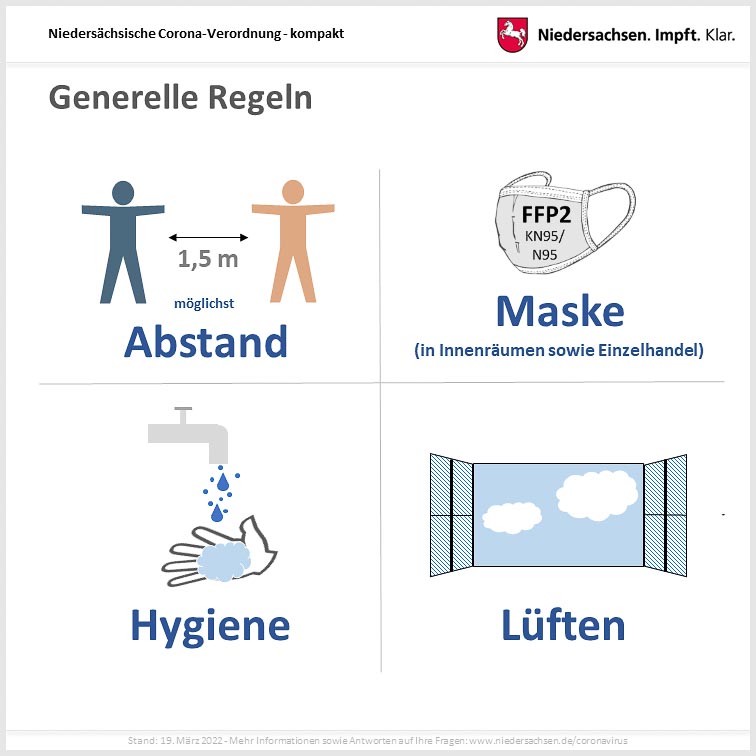 Vom 19. März bis 2. April gilt eine Übergangsfrist, von der auch in Niedersachsen Gebrauch gemacht wird. Ab Samstag tritt daher eine geänderte Übergangsversion der Corona-Verordnung in Kraft. Die wichtigsten Regeln im kurzen Überblick: