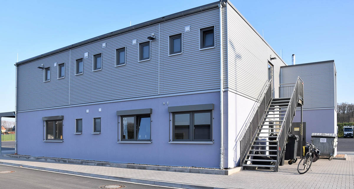 Der Sozialtrakt mit den Büros wurde in günstiger Containerbauweise errichtet. Es gibt eine Hackschnitzelheizung und noch in diesem Jahr wird eine Photovoltaikanlage auf dem Dach installiert. Öffentlich zugänglich sind bereits zwei Ladesäulen bis 22 KW.