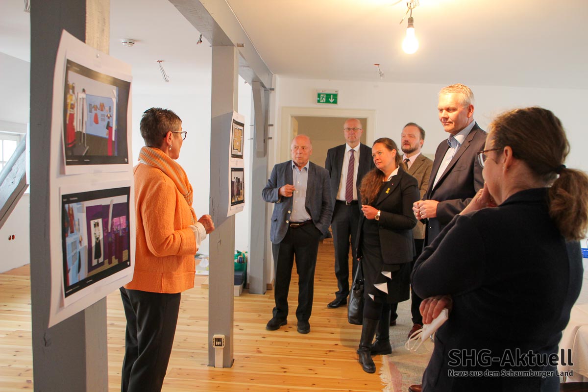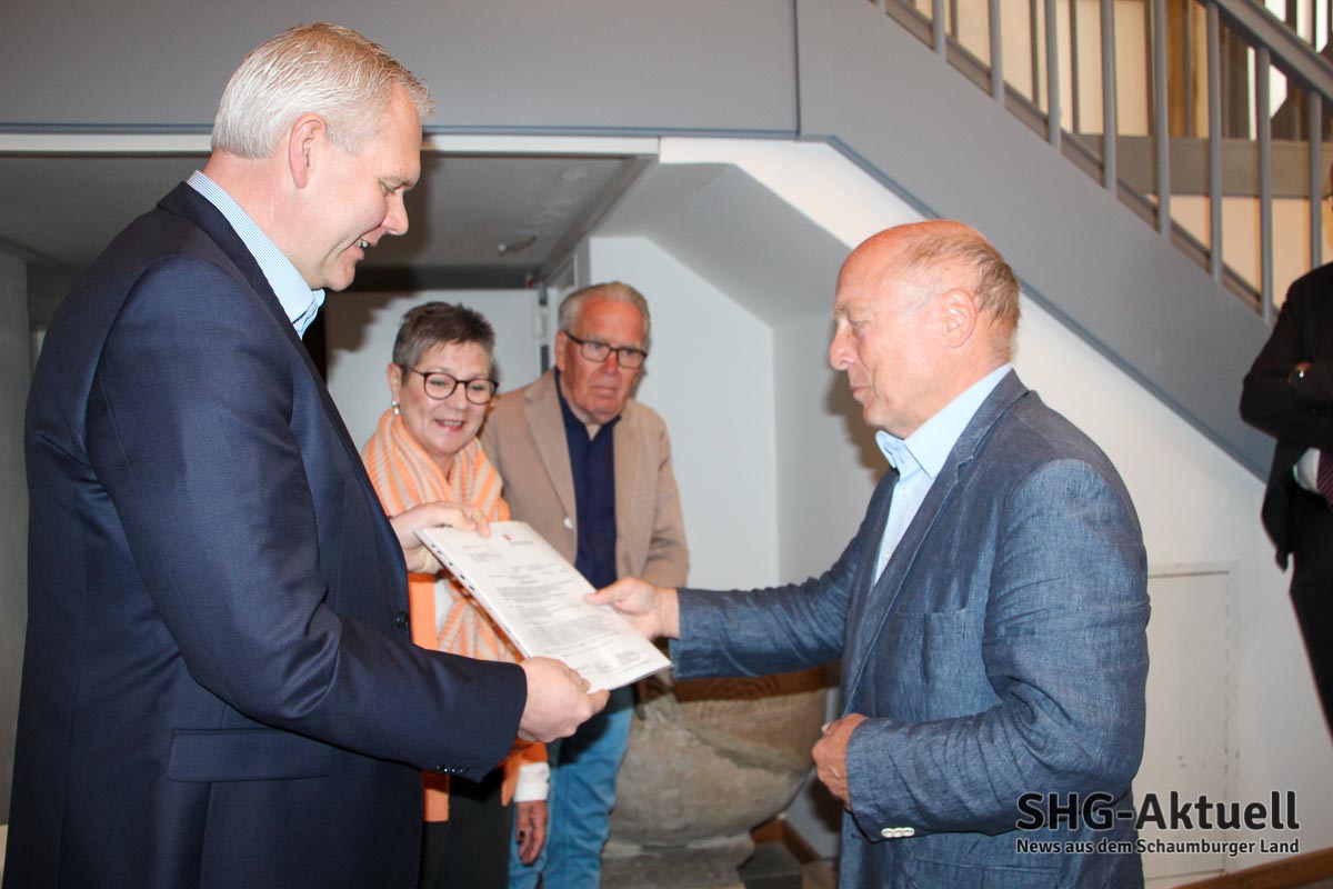 Eine kleine Feierstunde für das Museum: Im Beisein von Vorstandsmitglied Reiner Brombach, Bürgermeister Axel Wohlgemuth, Schatzmeister Udo Bokeloh sowie Museumsleiterin Anke Twachtmann-Schlichter, den Landtagsabgeordneten Karsten Becker und Colette Thiemann sowie dem stellvertretenden Landrat Horst Schwarze, Kulturausschuss-Vorsitzenden Albert-Brüggemann, Leiterin der Schaumburger Landschaft Lu Seegers und dem Hausherrn Alexander Fürst zu Schaumburger-Lippe übergab der niedersächsische Kultur- und Wissenschaftsminister Björn Thümler den Förderbescheid über 134.675 Euro.