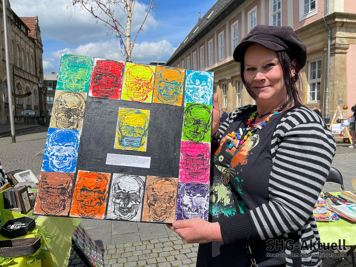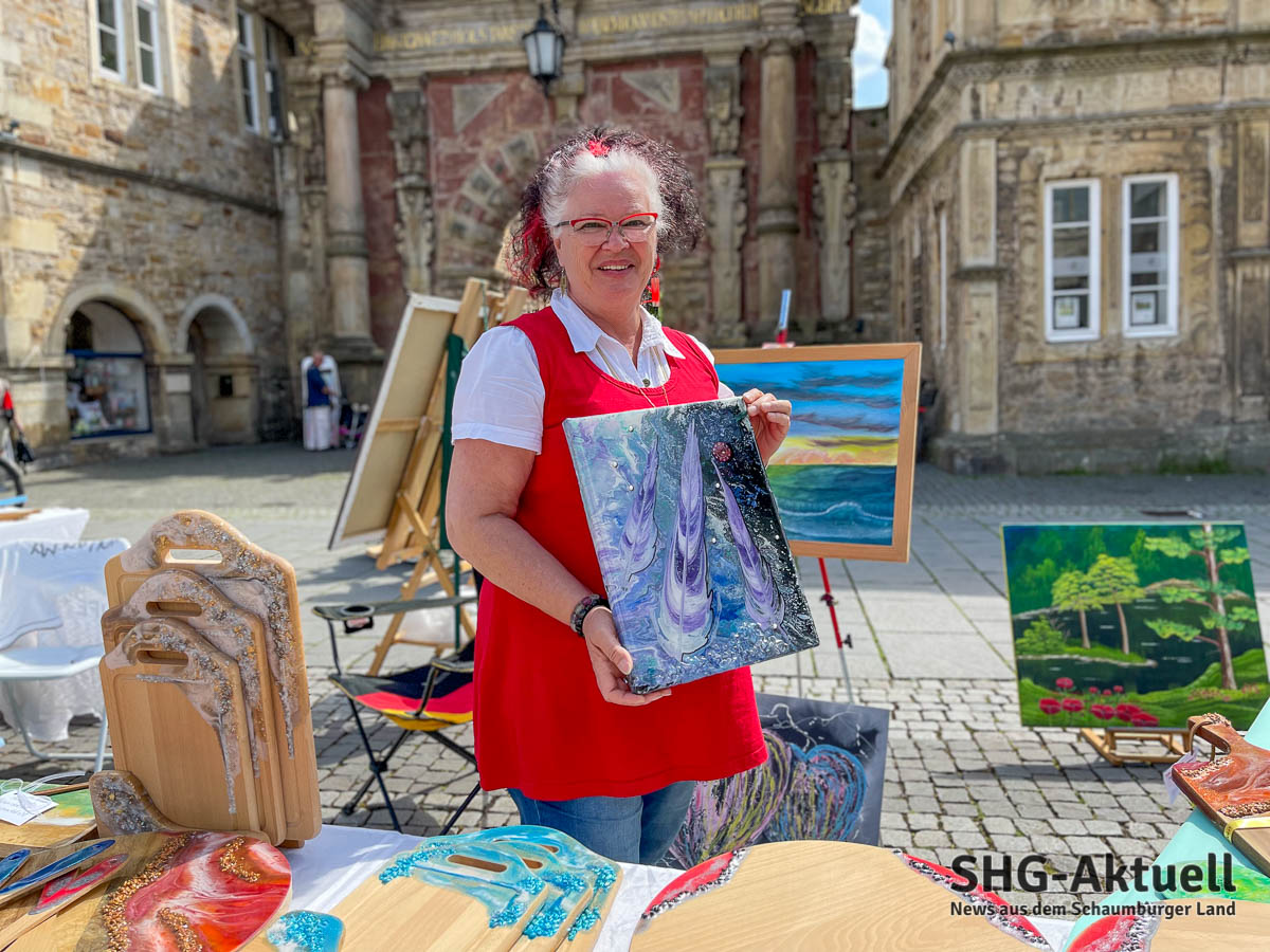Kalebassen-Kunst, Live-Malerei, Botschaften in Stein oder veredelte Haushaltshelfer mit Epoxidharz. Hier gab es wirklich für jeden Geschmack etwas zu sehen. Die bunten Küchenbretter oder Untersetzer lassen sich übrigens ganz normal benutzen, waschen und Schadstoffe sind aufgrund des verwendeten, Spezialmaterials auch kein Thema mehr, berichtet Künstlerin.