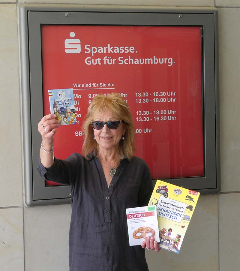 Durch eine Spende der Sparkasse Schaumburg in Höhe von 5.000 Euro konnten kindgerechte Eltern-Kind-Bildwörterbücher für ukrainische Geflüchtete und kompakte Bildwörterbücher für sogenannte ehemalige Afghanische Ortskräfte der Bundeswehr angeschafft werden.
