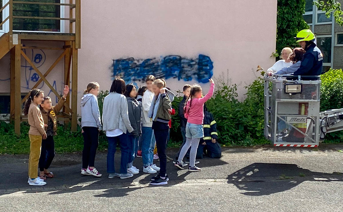 Als Am Nachmittag fünf große Feuerwehrfahrzeuge auf den ehemaligen Schulhof rollten, waren die Augen der Kinder groß.