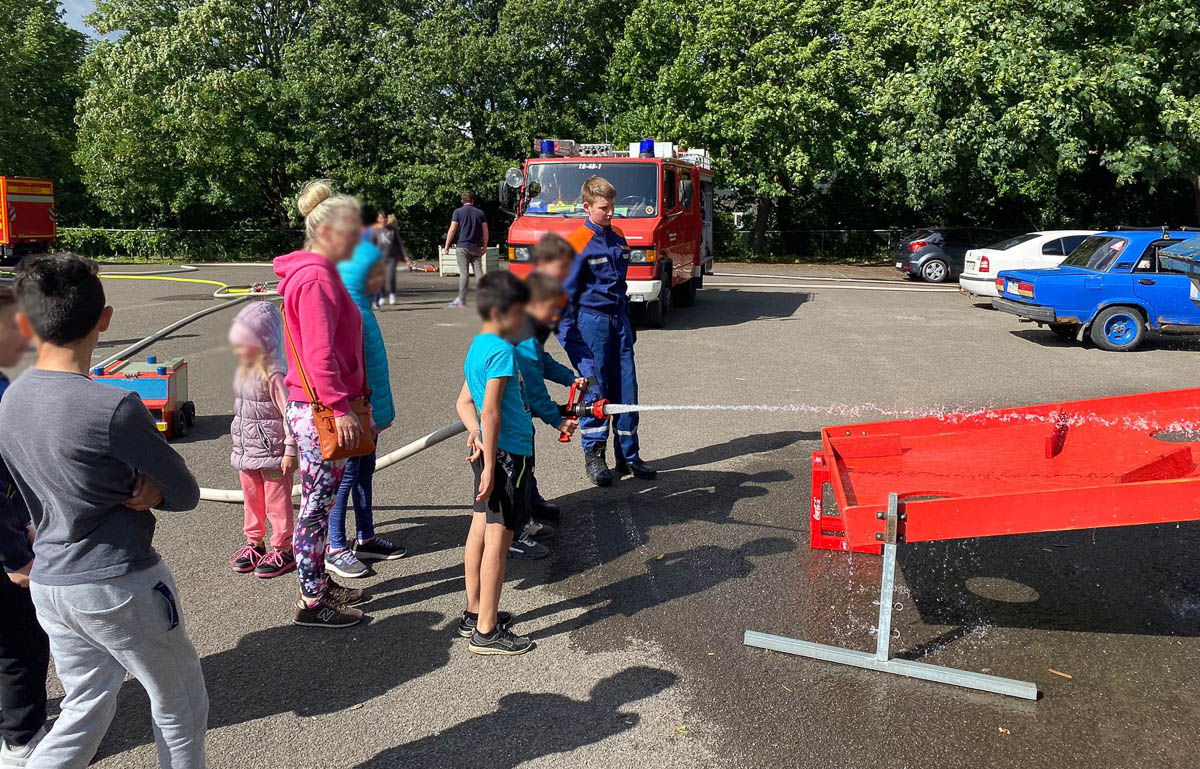 Nach wenigen Minuten waren die Einsatzkräfte und deren Nachwuchs aus der Jugendfeuerwehr von etwa 40 Kindern und deren Müttern umringt. Die Jugendfeuerwehr bot mehrere Aktionen an, neben dem mittlerweile schon legendären Wasserflipper konnten die Kinder mit Strahlrohren kleine Feuerwehrautos auf Schläuchen vorwärts treiben und mit Schläuchen auf Flaschen kegeln.