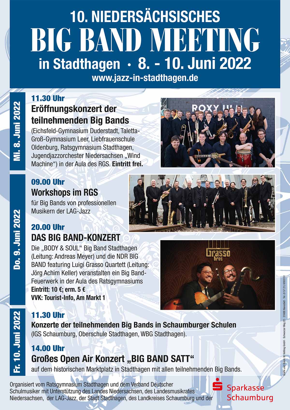 Das Ratsgymnasium Stadthagen präsentiert mit der Unterstützung des VDS-Niedersachsen, des Landes Niedersachsen, des Landesmusikrates Niedersachsen, der LAG Jazz Hannover und der Sparkasse Schaumburg vom 8. – 10. Juni 2022 das 10. Niedersächsische Big Band-Meeting