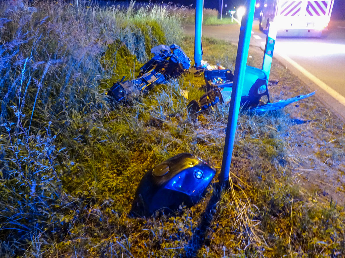 Der 23-jährige Mann ist nach einem Zusammenstoß mit dem VW einer 80-jährigen Bad Eilserin vom Krad gestürzt und zog sich nach ersten Erkenntnissen der Polizei eine Beinfraktur zu. Das Krad schleuderte anschließend führerlos gegen einen Lampenmast und brach in mehrere Teile auseinander. Der Verletzte wurde mit einem Rettungswagen in das Klinikum nach Minden gefahren.