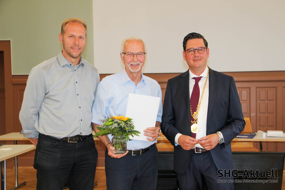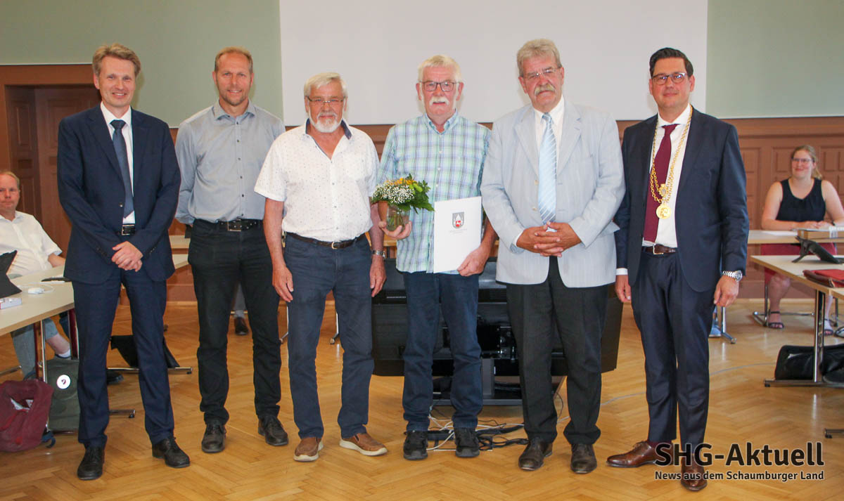 „Wir leben davon, dass sich Menschen engagieren und möchten dafür heute besonderen Dank aussprechen“, leitete Ratsvorsitzender Dieter Wilharm-Lohmann die Ehrungen ein. Bürgermeister Axel Wohlgemuth fügt hinzu: „Eigentlich ist es guter Usus, diese bereits im Winter zu tun, doch aus gegebenen Gründen haben wir dies verschoben“. Beim obligatorischen Gruppenbild habe es auch an diesem Sitzungstag einige Lücken gegeben, doch im Rückblick auf die vergangenen Ratsperiode sei nochmal schmerzlich bewusst geworden, welche Lücken auch die beiden plötzlich verstorbenen Ratsherren Bernd Insinger und Wolfhard Müller hinterlassen haben. So habe sich auch der restliche Rat nach diesem Verlust neu sortieren müssen. „Deswegen wollen wir heute auch an diese beiden Ratskollegen denken“.