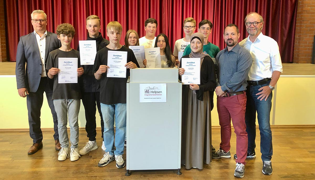 (Helpsen) Im Rahmen der Kooperation zwischen der Volksbank in Schaumburg und der IGS Helpsen erhielten 134 Schülerinnen und Schüler des 9. Jahrgangs zum Ende des Schuljahres ihre verdienten Zertifikate zum Seminar „Erfolgreich bewerben“. Stellvertretend für die gesamte Klassengemeinschaft nahmen die gewählten Klassensprecher die Zertifikate entgegen.