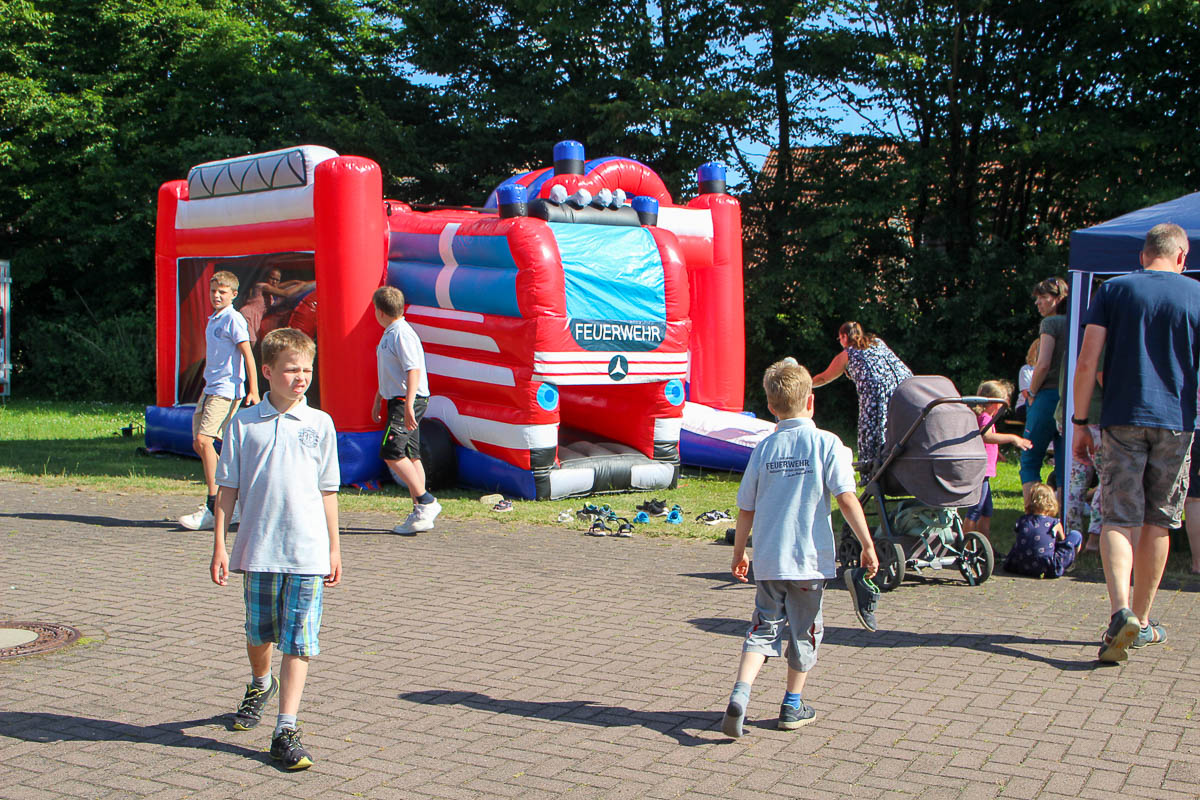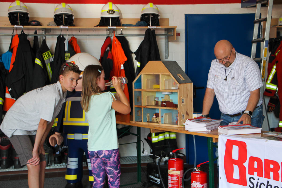 Für die kleinen Besucher gab es neben einer zum Feuerwehr-Thema passenden Hüpfburg auch das feuchtfröhliche Vergnügen, mal selber mit dem Schlauch und der Wasserspritze hantieren zu dürfen – natürlich unter fachmännischer Aufsicht. In der Halle zeigte ein kleines „Brandhaus“ Interessierten, wie schnell sich bei einem Brand Rauch entwickelt und im Haus verbreitet. Diese Brandberatung samt der umfassenden Beratung der Fachleute der Firma Barduhn zum Thema Rauchmelder stieß auf reges Interesse bei den Besuchern. Am frühen Abend wurde die Veranstaltung durch eine Andacht mit Pastor Ulrich Hinz von der Kirchengemeinde Meinsen, im Kontext der Nächstenhilfe auch direkt in der Fahrzeughalle, abgerundet.