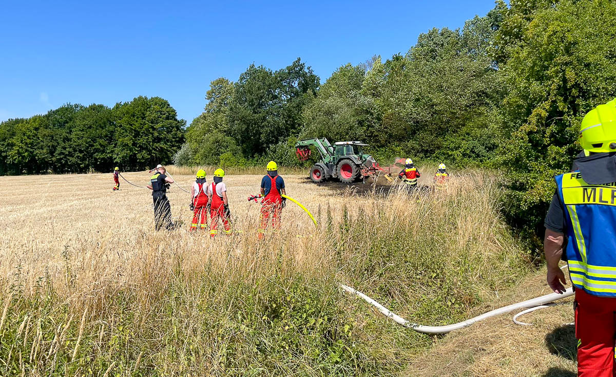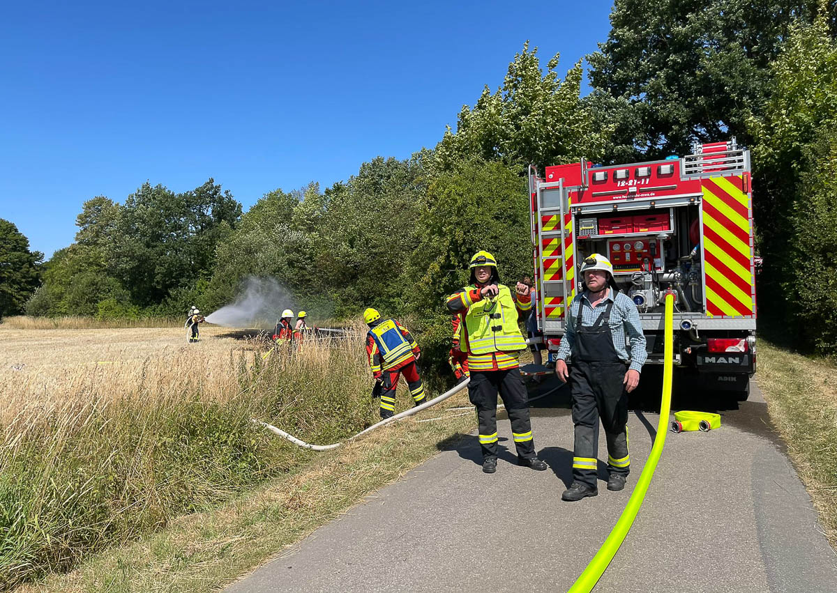 Zunächst pumpten die Brandbekämpfer den Inhalt eines Tanklöschfahrzeugs, rund 3.000 Liter Wasser, auf den brennenden Teil des Ackers.