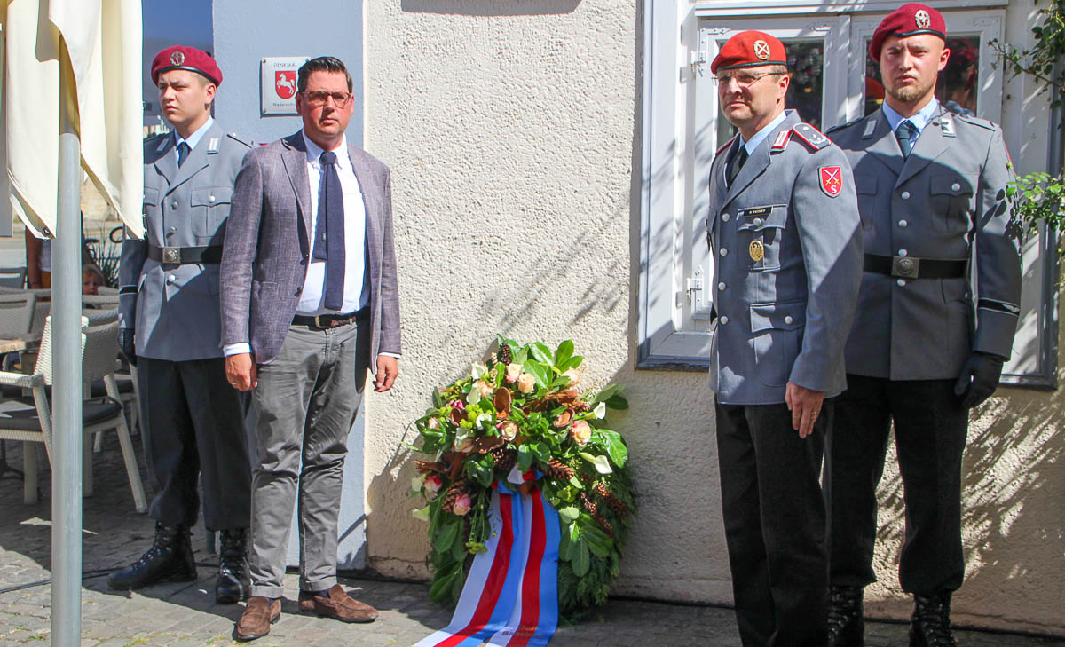 Gemeinsam mit Roman Praschek, Kommandant der Jägerkaserne und den Bundeswehrsoldaten Friedrich Schmeling und Jan Happey wurde vor der Plakette der Gedenkkranz niedergelegt.