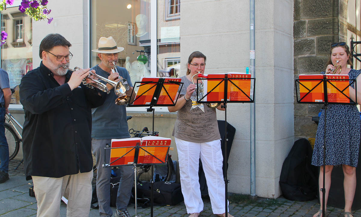 Zur passenden musikalischen Untermalung des Posaunenchores der Stadtkirchengemeinde forderte Wohlgemuth die Anwesenden auf, das Gedenken an die Widerstandskämpfer wachzuhalten: „Die Geschehnisse verblassen mit den Jahren, doch die Erinnerung gilt auch als Mahnung für den anhaltenden Einsatz für die Demokratie“.