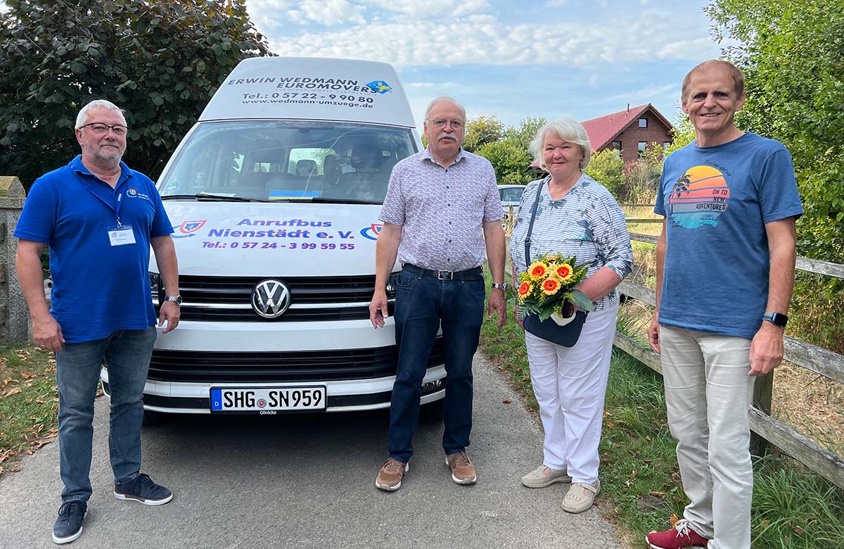 (Bückeburg/Nienstädt) Den Anrufbusfahrern aus Nienstädt ist die Strecke nach Bückeburg über Rusbend schon länger bekannt. Dass aber der Kleinbus vor dem Haus von Marlies und Jochen Spiehl angehalten hat, ist neu und war für die Rusbender eine sichtliche Freude.