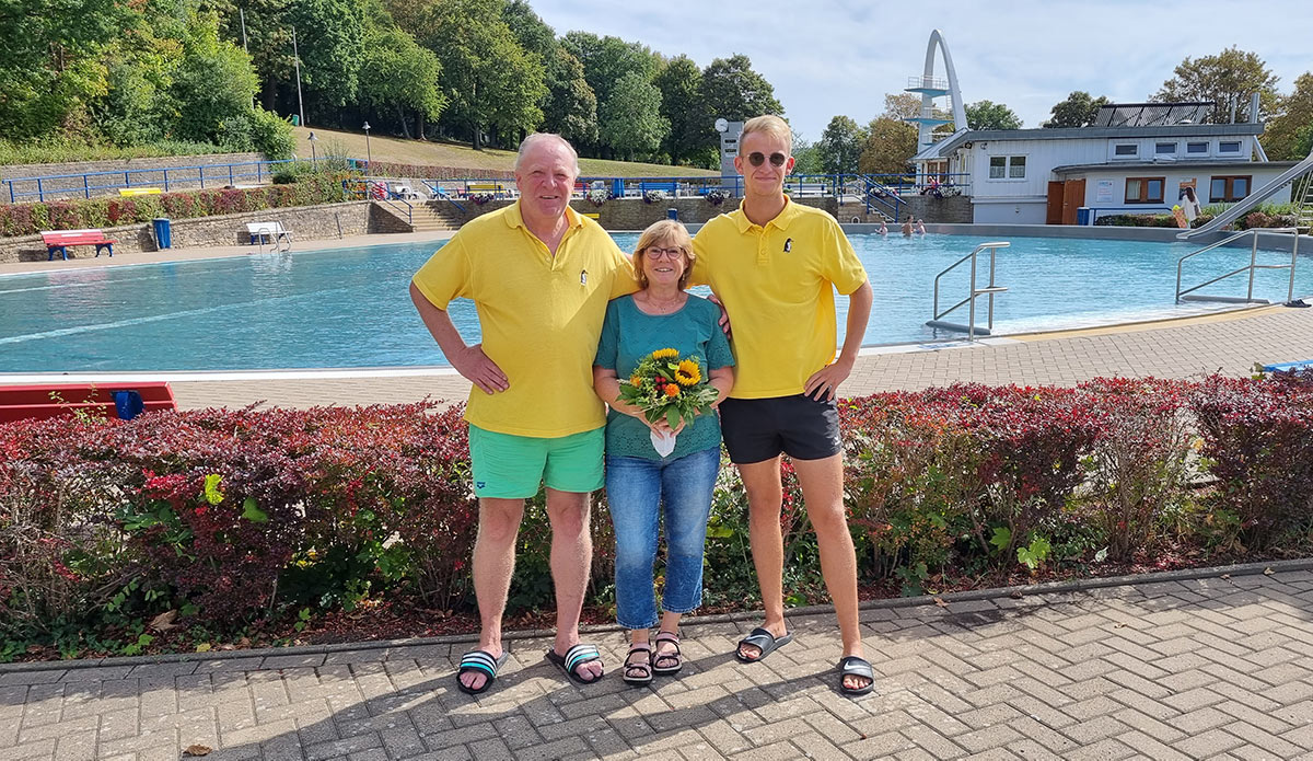 Klaus Kramer und Nick Reichwage gratulierten ihr feierlich und übereichten Hitzemann im Namen der Geschäftsführung einen Blumenstrauß sowie eine Saisonkarte für die nächste Sommersaison 2023. Für sie als Bergbadfan und Saisonkartenbesitzerin kam es sehr gelegen schon jetzt eine Saisonkarte 2023 zu erhalten.