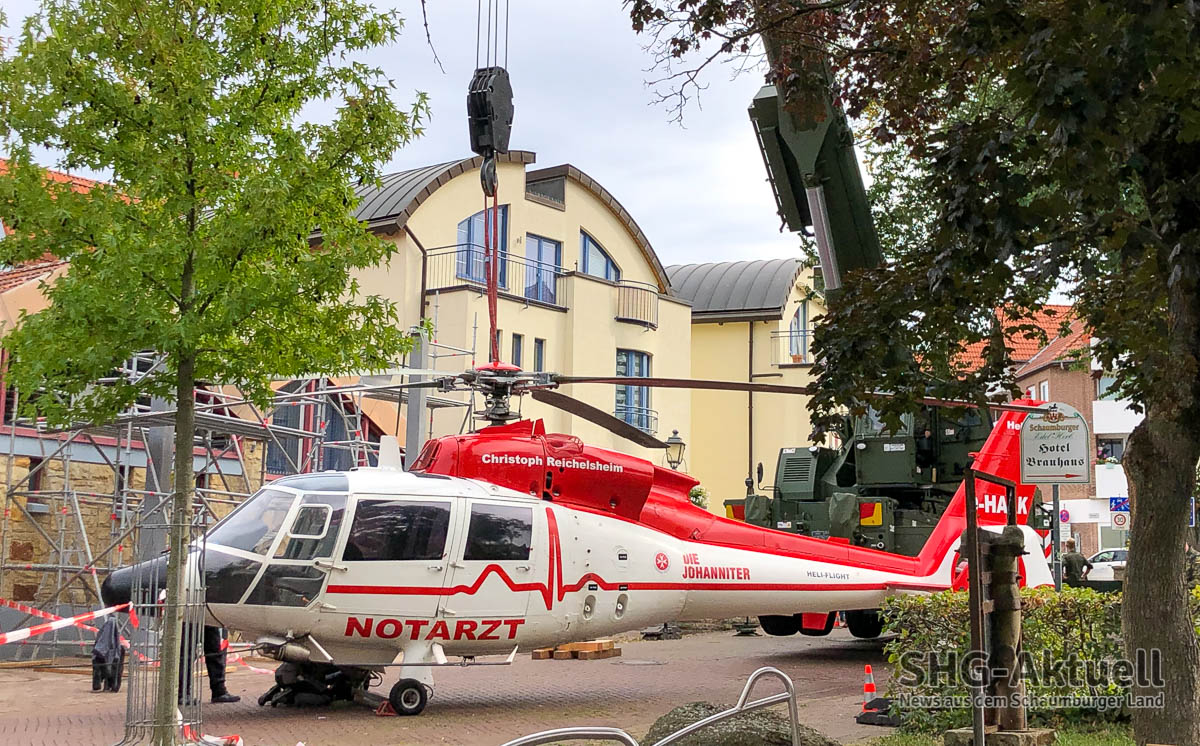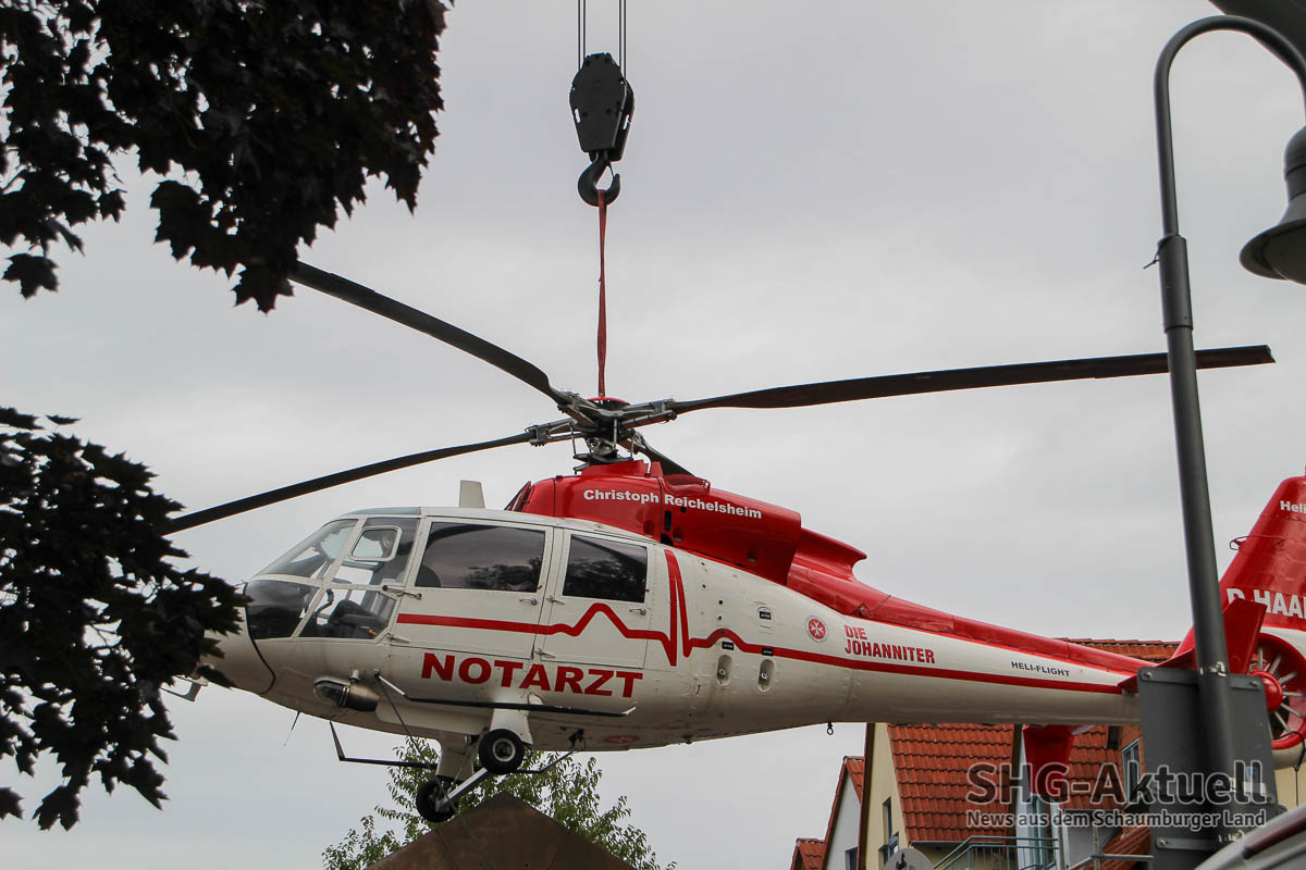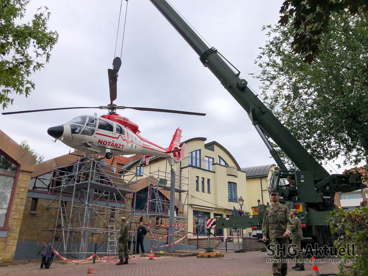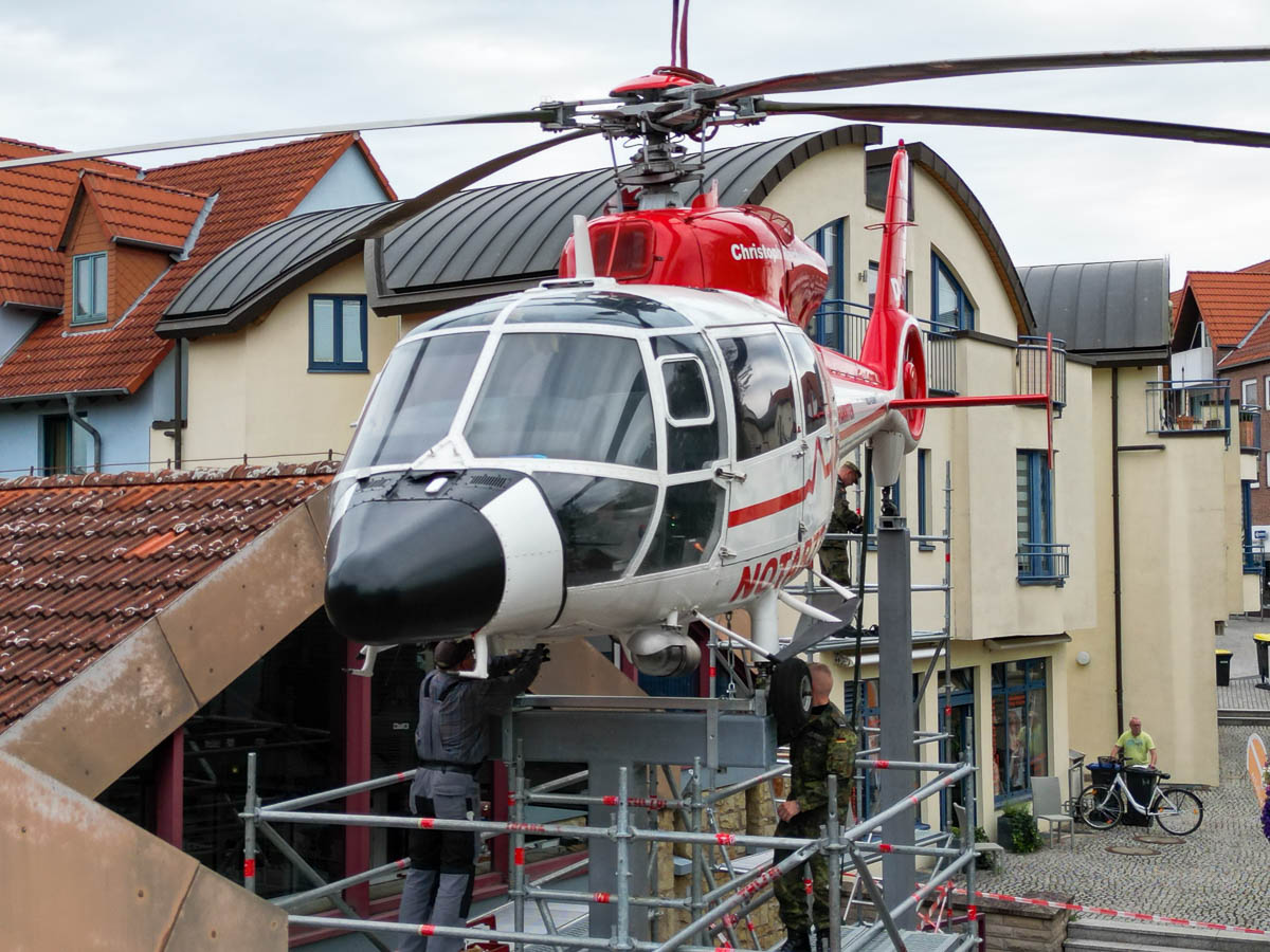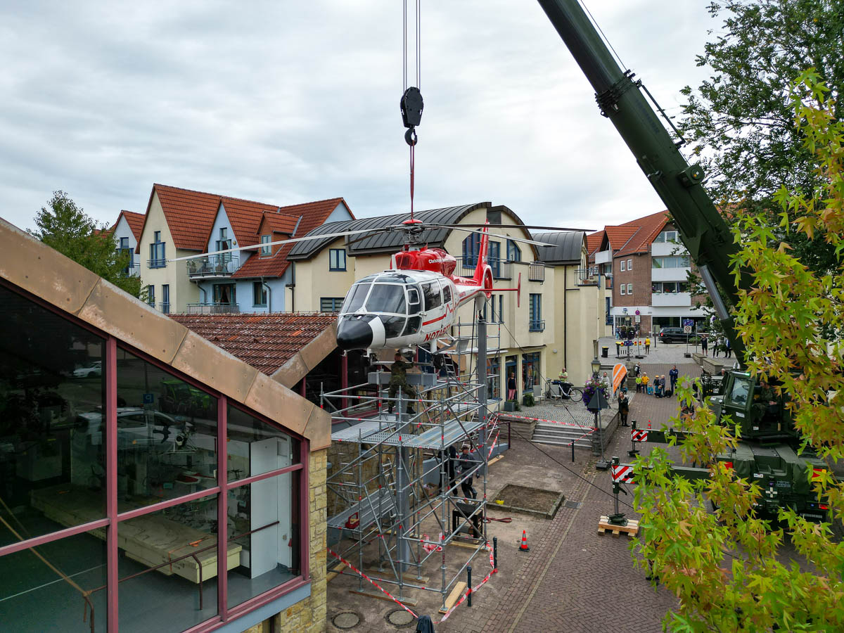 Mit einem Schwertransport rollte die rund 1,9 Tonnen schwere, französische Dauphin-HAAK, vormals im Einsatz unter dem Funkrufnamen „Christoph Reichelsheim“ aus Achum zum Sablé-Platz. Auch eine Straßensperrung hielt interessierte Passanten und Technikliebhaber nicht davon ab, der letzten „Landung“ des einstigen Rettungshubschraubers beizuwohnen.