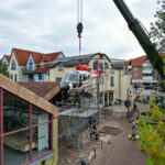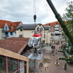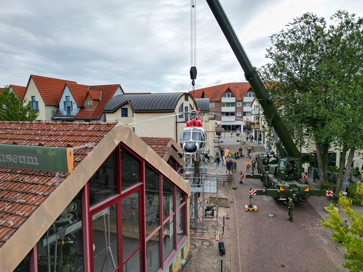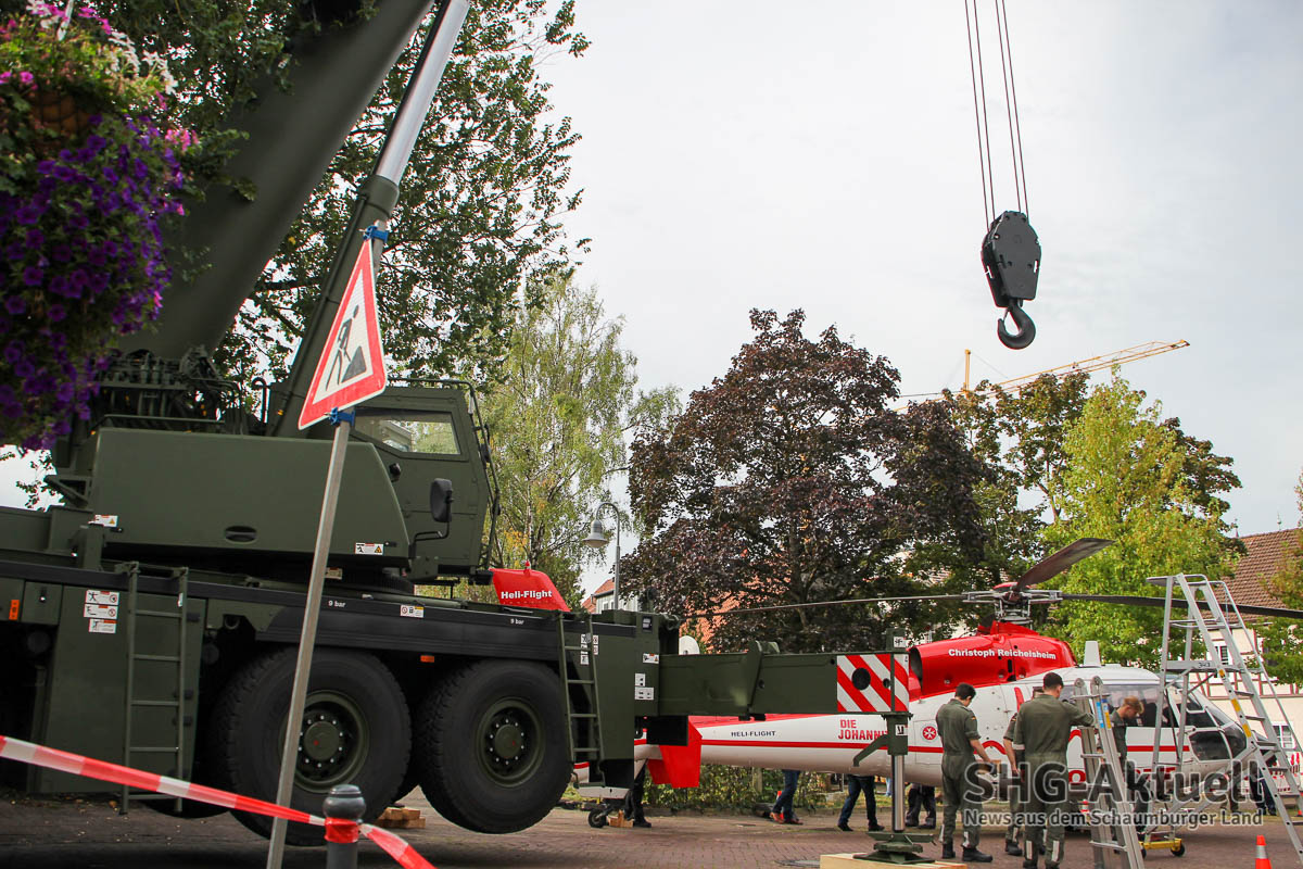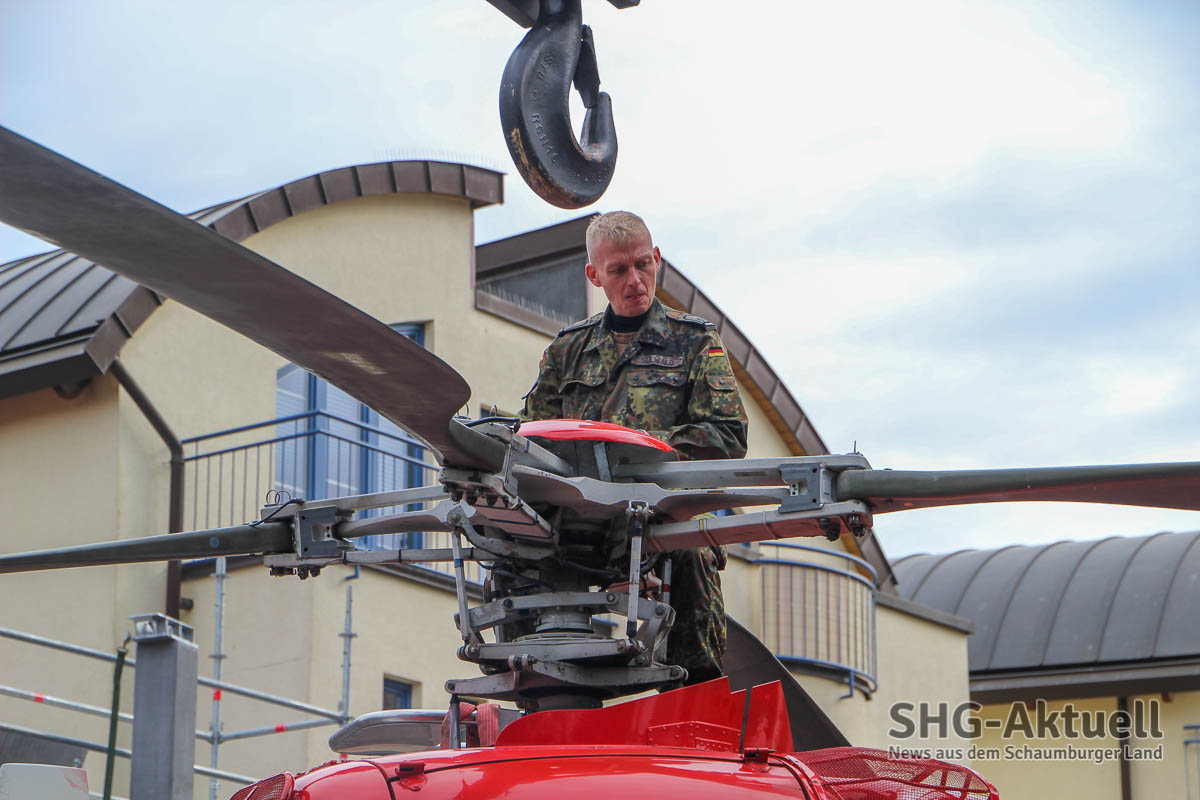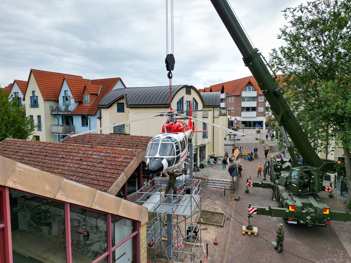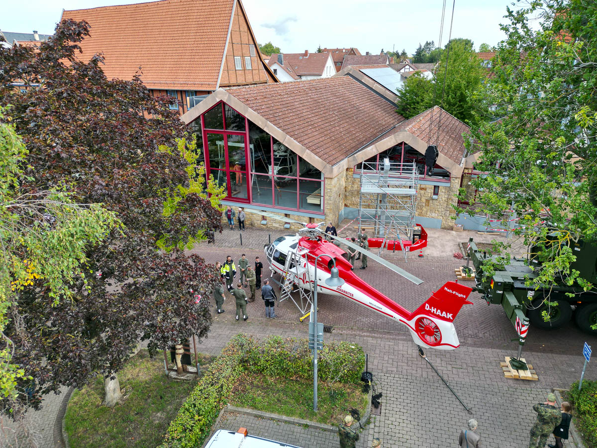 Rund 20 Kameraden der Bundeswehr und der Ausbildungswerkstatt des Heeres rücken an diesem Morgen mit schwerem Gerät an, um die „Christoph Reichelsheim“ mithilfe eines Krans auf ihren letzten Landeplatz zu bugsieren. Dabei ist nicht nur Maschinenkraft, sondern auch Augenmaß und Fingerspitzengefühl gefragt, um das tonnenschwere Fluggerät ohne Schäden an Mensch, Umgebung und Hubschrauber sanft und sicher abzusetzen. Nur Zentimeter trennen Rotorblätter beim Hebemanöver von angrenzenden Gerüsten und Schildern, doch die Aktion läuft wie geplant und gegen 11.30 Uhr ist die Dauphin schließlich „gelandet“.