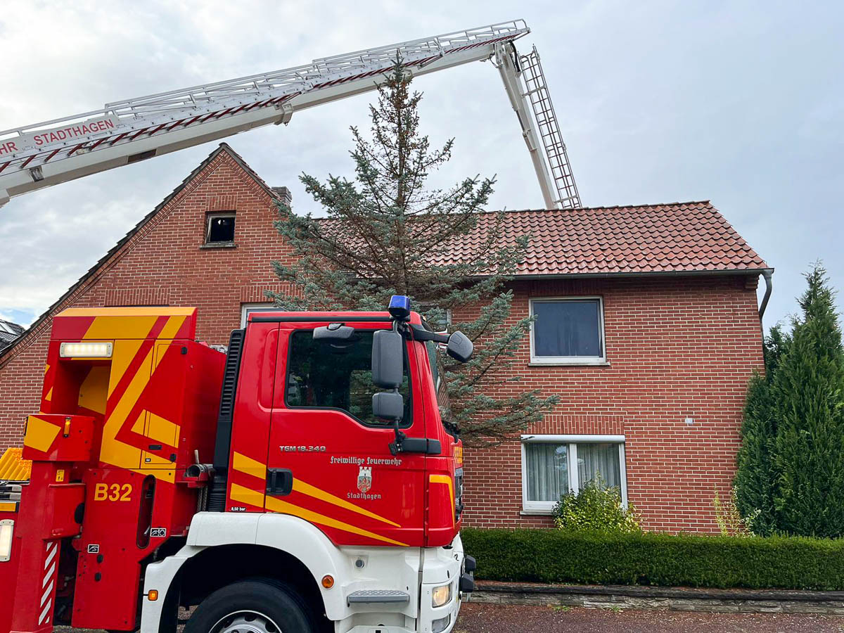 Feuerwehrkräfte mit der Hubrettungsbühne aus Stadthagen gingen vor dem Haus in Stellung und begannen damit, das Dach abzudecken und abzulöschen. Nach kurzer Zeit konnte das Feuer unter Kontrolle gebracht werden. Das Gebäude wurde vorsorglich stromlos geschaltet.