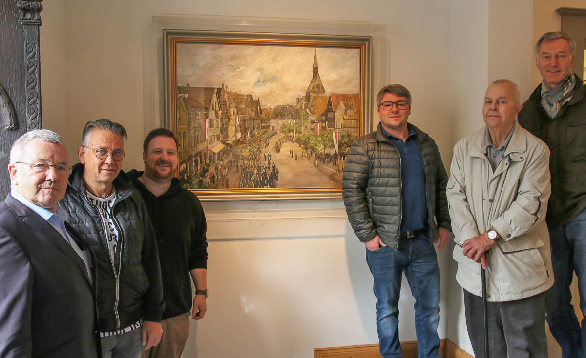 (Stadthagen) Das Ölgemälde „Schützenausmarsch 1957“ wird auch weiterhin im Eingangsbereich der Tourist-Info in Stadthagen hängen und damit für die Öffentlichkeit zu betrachten sein.
