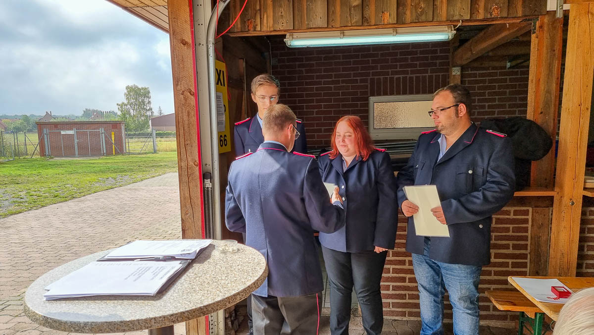 Steege lobte die gute Dienstbeteiligung der Kameraden, die er auch als Ergebnis der gemeinsamen Übungsdienste mit der Feuerwehr Sachsenhagen sieht. Zusätzlich zu den Diensten stehen im Jahr 2021 acht Einsätze im Dienstbuch. So wurden die Kameraden zu fünf Brandeinsätzen und drei technischen Hilfeleistungen alarmiert. Ein besonderes Highlight war der Besuch bei der Partnerfeuerwehr Westeregeln. Mit einem Jahr Verspätung konnte die 30-jährige Freundschaft der beiden Feuerwehren im September des letzten Jahres gefeiert werden. Nach einem Besuch in einer alten Ziegelei, dort erhielten die Kameraden eine Führung durch den ehemaligen Leiter der Feuerwehr Westeregeln, rundete ein gemütliches Beisammensein den Besuch ab.