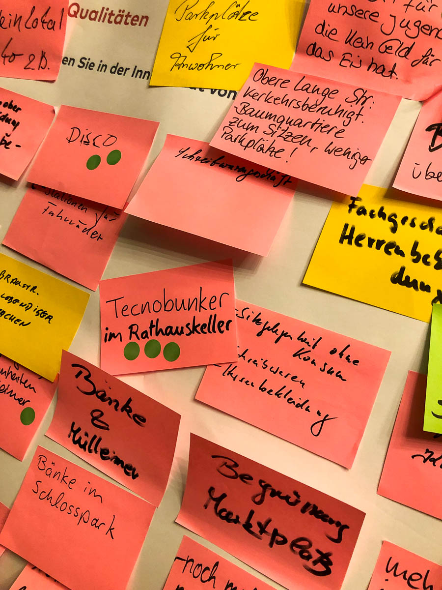 Interessant wurde es beim Benennen der Stadt in drei Schlagworten. „Altbacken, mit Charme“ könnte die Quintessenz lauten, der jedoch nicht alle zustimmen würden. „Ich würd’s historisch nennen“, scherzte Citymanager Claas Marienhagen. Die Arbeitsphase stellt sich als recht ertragreich heraus: Die dunklen Gassen und Passagen, die Parkpalette und der Bahnhof werden eher schlecht bewertet und gemieden. Die Lange Straße, der Markt, Schloss(park), die Museen, Banken, Gesundheitsdienstleistungen und vor allen Dingen die Gastronomie werden bevorzugt besucht und als Stärken herausgestellt. Schlecht kommen ebenfalls die Radwege und der ÖPNV in Bückeburg weg, Parkplätze in der Innenstadt werden jedoch weiter gewünscht, bestenfalls kostenlos. Die Menschen wünschen sich mehr Sitzgelegenheiten, Mülleimer, ein „Tanzlokal“ bis hin zu einem „Technobunker“ im Rathauskeller, mehr Kinderspielgeräte, mehr Grün und Pop-up-Events.