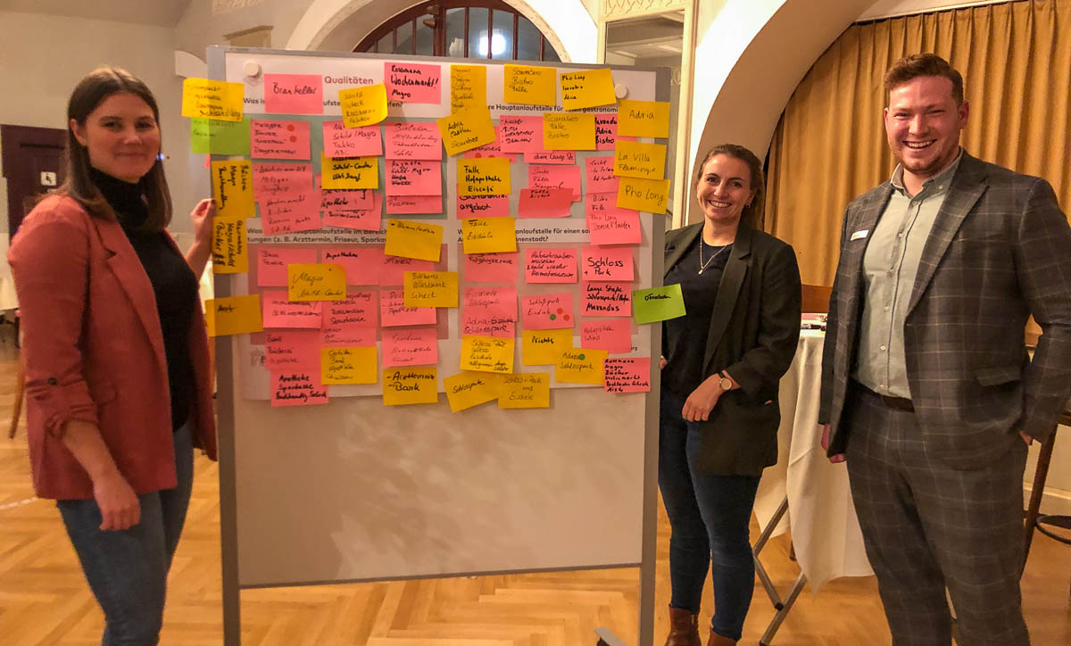 Katharina Ruhr und Jaqueline Suchanek erläuterten den Fahrplan für den Abend sowie die kommenden Monate: Neben den Ergebnissen aus der folgenden Ideensammlung werde eine Online-Befragung durchgeführt, um möglichst viele Bürger mitzunehmen. Ziel ist eine ganzheitliche Betrachtungsweise der Innenstadt mit anschließender Formulierung einer Zielvision, die anschließend mit konkreten Maßnahmen umgesetzt werden soll. Mit einer funktionalen, einer städtebaulichen und einer Markenqualitätsanalyse werden Stärken und Schwächen zusammengebracht. Die Konzeptumsetzung und die Innenstadtsanierung sollen zusätzlich mit einem Innenstadtnetzwerk verstetigt werden. „Für dieses Projekt brauchen wir ihre Expertise und Ortskenntnis“, so Suchaneck.