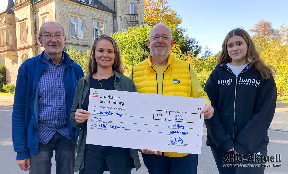 Insgesamt 1720 Euro waren an diesem Abend zusammengekommen und sollten zu einem späteren Zeitpunkt zur einen Hälfte der Ukrainehilfe, zur anderen Hälfte der Freien Schule Schaumburg zugutekommen. Nun war es endlich soweit: Im sonnigen Ambiente und mit guter Laune konnte Kohlenberg zwei Schecks zu je 860 Euro an Alexander Fürst zu Schaumburg-Lippe für die Organisation Interhelp und an Schulleiter Gunther Malz sowie Franziska Hautau und Josy Schwarz für die Freie Schule übergeben.