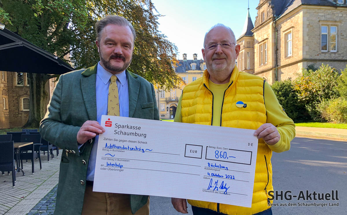 Den zweiten Scheck nahm dankend Alexander Fürst zu Schaumburg-Lippe entgegen. Mit der Zusage Kohlenbergs soll die Summe für die Ukraine-Hilfe vor Ort, die Interhelp seit Beginn des Krieges leistet, genutzt werden. Unter anderem wird medizinisches Material und Gerät davon finanziert. „Ich danke herzlich im Namen von Interhelp, die Summe können wir gut gebrauchen“, so zu Schaumburg-Lippe. (Text & Fotos: nh)