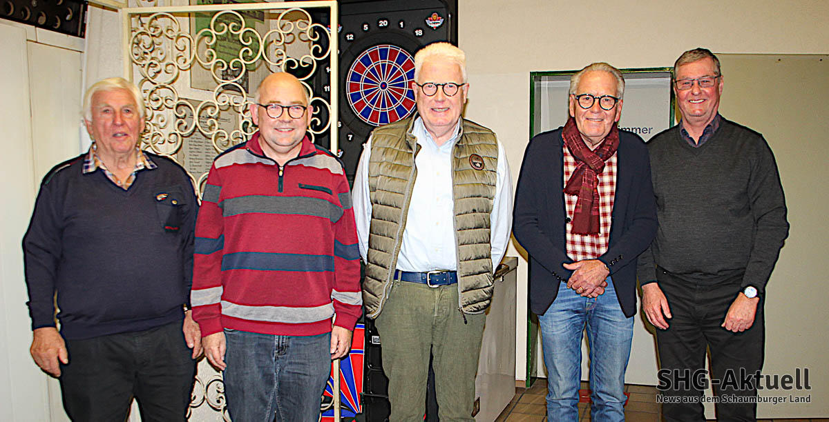 Garloff Katz (v.li) wird für stolze 65 Jahre Mitgliedschaft im VfL geehrt; Michael Einars wird für 40 Jahre, Hagen Bokeloh und Udo Bokeloh für 60 Jahre sowie Uwe Völkening für 50 Jahre Treue zum Verein ausgezeichnet.