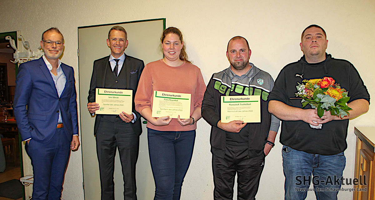 Martin Brandt (v.li) ehrt Jens Ulbrich, Fiona Rosenthal sowie die erste Tischtennis-Mannschaft für besondere sportliche Leistungen.