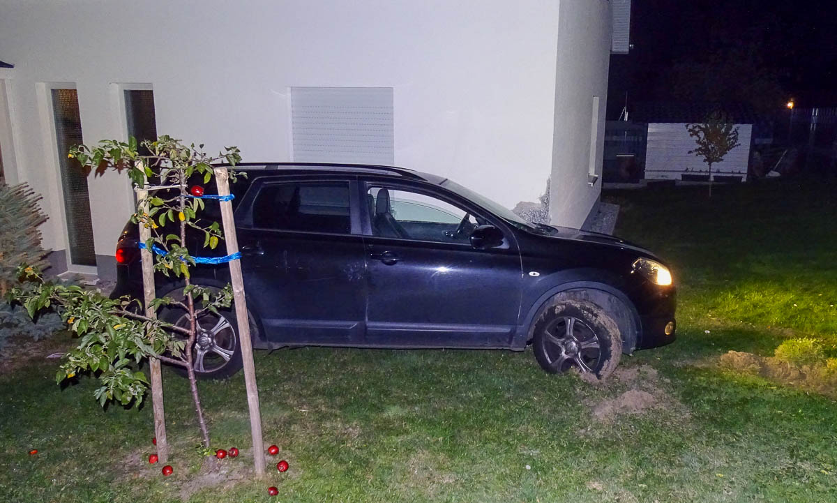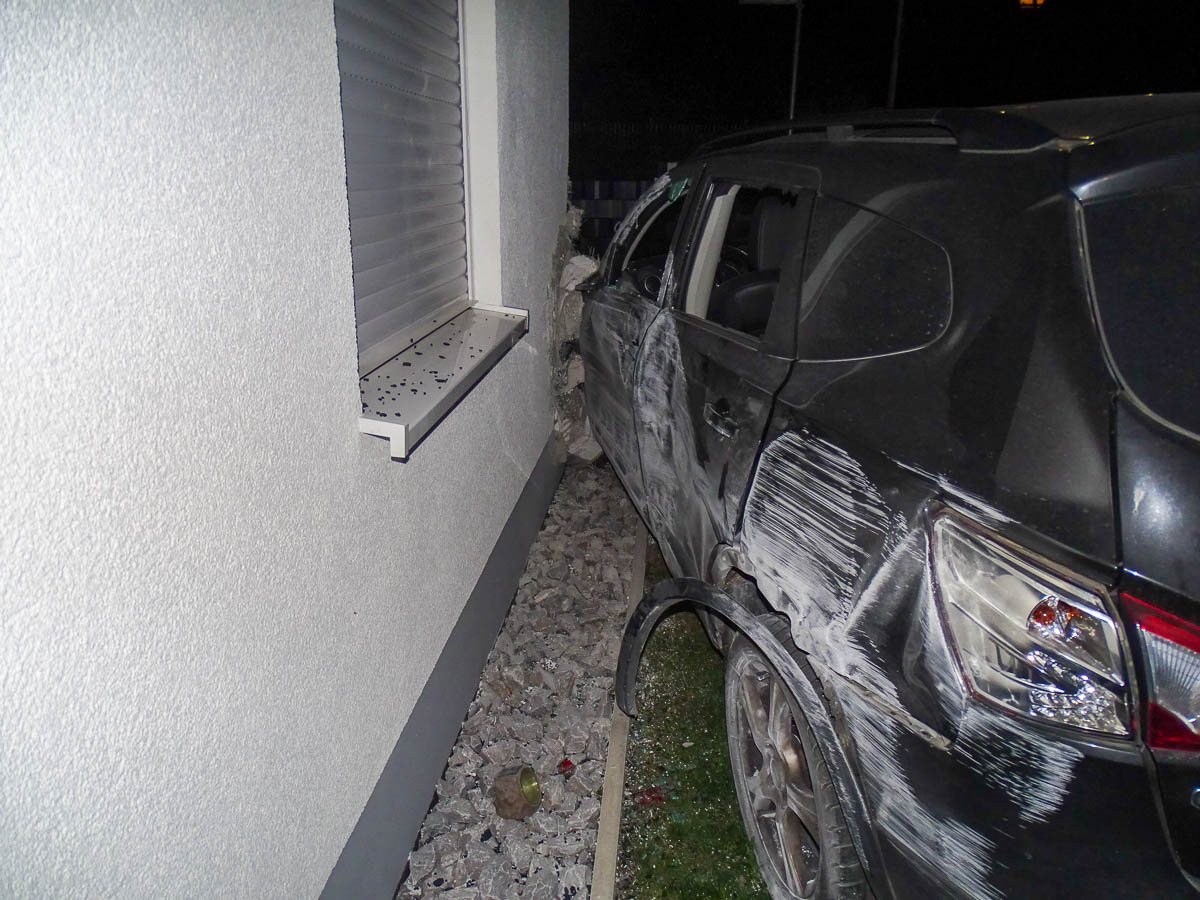 Hier schrammte der Wagen mit der kompletten Fahrerseite an der Hauswand entlang. An Auto und Gebäude entstand Sachschaden, verletzt wurde jedoch niemand. Eine Beeinflussung durch alkoholische Getränke oder andere berauschende Mittel konnte vor Ort ausgeschlossen werden. Der PKW musste mittels Kran aus dem Vorgarten gehoben werden. (po/Fotos: Polizei)