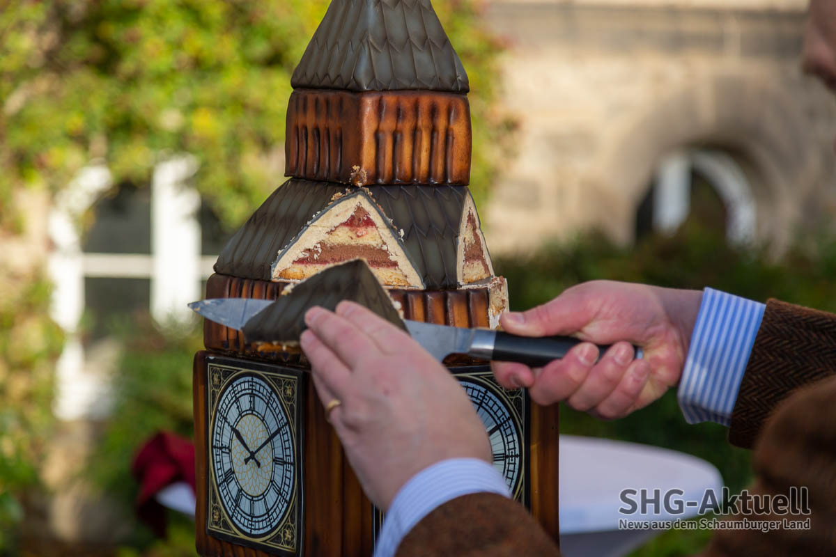 Erst durchschnitt Fürst Alexander das symbolische Band am Eingang, anschließend zerschnitt er den Glockenturm von „Big Ben“. Zuerst verlor das Wahrzeichen seine Spitze, dann wurde das Uhrwerk zerteilt.