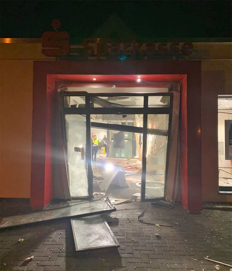 Die Polizei wurde am Freitagmorgen gegen 2.45 Uhr durch ein Sicherheitsunternehmen über die Sprengung informiert. Vor Ort stellten die Einsatzkräfte dann fest, dass einer von drei im Foyer der Bank befindlichen Automaten betroffen war.