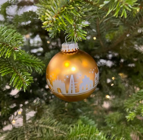 Außerdem wurden wieder die beliebten Weihnachtskugeln mit der filigranen Bückeburg-Silhouette geordert. Nachdem im letzten Jahr Kugeln in den Farben grün und rot die Weihnachtsbäume geschmückt haben, gibt es sie in diesem Jahr in einem leuchtenden Pink sowie in einem klassischen Goldton.